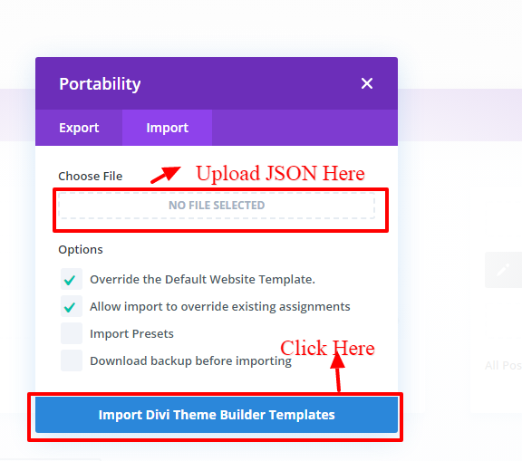 B. Now click on the Import button and then Choose the ‘ Theme Builder JSON ‘ file from the Supplementary Package you’ve downloaded and Click on Import Divi Theme Builder Templates Button.