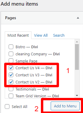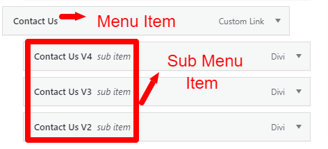 Like in example shown below have added ‘ Contact Us ‘ as menu item and ‘ Contact Us V2 to V4 ‘ as sub-menu item