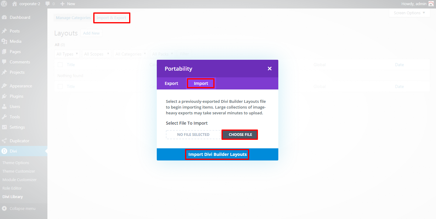 B. Import product ‘ Library Layout (.json) File ‘ Thats is ‘All_Styles_Library_Json ’ under ‘‘ Divi -> Divi Library -> Click Import & Export